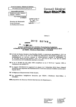 portant notification de la décision d'autorisation budgétaire et fixation des prix de journée hébergement et des tarifs dépendance 2013 de l'EHPAD "Résidence Saint-Gilles" à COLMAR. Resumé Pièces jointes ARRETE Assemblée : Non défini Date : 28/03/2013 Rapporteur : Non défini Collectivité : Conseil départemental du Haut-Rhin Direction : Non défini Service : Direction de l'Autonomie Domaine : Prix de Journée Commission :