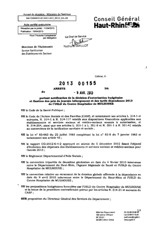 portant notification de la décision d'autorisation budgétaire et fixation des prix de journée hébergement et des tarifs dépendance 2013 de l'USLD du Centre Hospitalier de MULHOUSE. Resumé Pièces jointes ARRETE Assemblée : Non défini Date : 09/04/2013 Rapporteur : Non défini Collectivité : Conseil départemental du Haut-Rhin Direction : Non défini Service : Direction de l'Autonomie Domaine : Prix de Journée Commission :