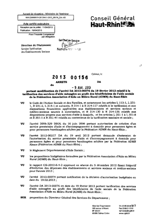 portant modification de l'arrêté DA 2013-00076 du 19.02.2013 relatif à la tarification des services d'aide ménagère au profit des bénéficiaires de l'aide sociale de la Fédération Association d'Aide en Milieu Rural (ADMR) du Haut-Rhin. Resumé Pièces jointes ARRETE Assemblée : Non défini Date : 09/04/2013 Rapporteur : Non défini Collectivité : Conseil départemental du Haut-Rhin Direction : Non défini Service : Direction de l'Autonomie Domaine : Prix de Journée Commission :