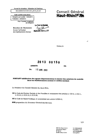 portant habilitation des agents départementaux à exercer des missions de contrôle dans les établissements sociaux et médico-sociaux. Resumé Pièces jointes ARRETE Assemblée : Non défini Date : 15/04/2013 Rapporteur : Non défini Collectivité : Conseil départemental du Haut-Rhin Direction : Non défini Service : Direction de l'Autonomie Domaine : Autres (non classés) Commission :