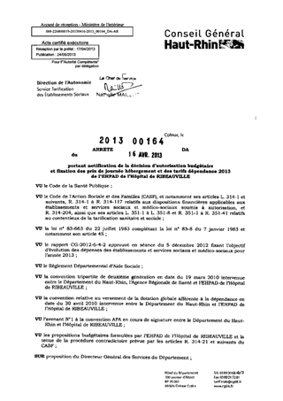 portant notification de la décision d'autorisation budgétaire et fixation des prix de journée hébergement et des tarifs dépendance 2013 de l'EHPAD de l'hôpital de RIBEAUVILLE. Resumé Pièces jointes ARRETE Assemblée : Non défini Date : 16/04/2013 Rapporteur : Non défini Collectivité : Conseil départemental du Haut-Rhin Direction : Non défini Service : Direction de l'Autonomie Domaine : Prix de Journée Commission :