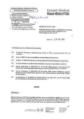 portant nomination du Président Délégué au sein de la commission départementale d'aménagement commercial. Resumé Pièces jointes ARRETE Assemblée : Non défini Date : 23/04/2013 Rapporteur : Non défini Collectivité : Conseil départemental du Haut-Rhin Direction : Non défini Service : Service Développement Economique Domaine : Autres (non classés) Commission :