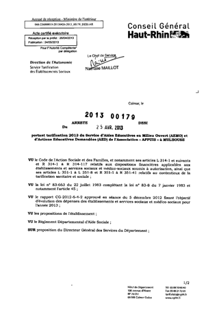 portant tarification 2013 du service d'aides éducatives en milieu ouvert (AEMO) et d'actions éducatives demandées (AED) de l'association "APPUIS" à MULHOUSE. Resumé Pièces jointes ARRETE Assemblée : Non défini Date : 25/04/2013 Rapporteur : Non défini Collectivité : Conseil départemental du Haut-Rhin Direction : Non défini Service : Direction de l'Autonomie Domaine : Prix de Journée Commission :