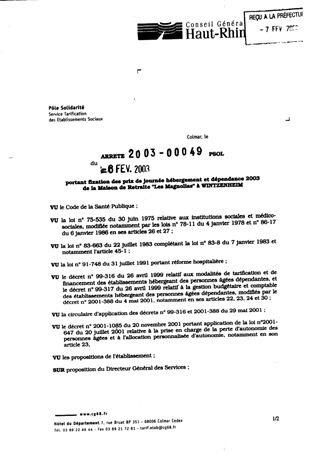 portant fixation des prix de journée hébergement et dépendance 2003 de la maison de retraite "Les Magnolias" à WINTZENHEIM. Resumé Pièces jointes ARRETE Assemblée : Non défini Date : 06/02/2003 Rapporteur : Non défini Collectivité : Conseil départemental du Haut-Rhin Direction : Non défini Service : Direction de la Solidarité Domaine : Prix de Journée Commission :