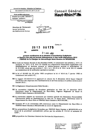 portant notification de la décision d'autorisation budgétaire et fixation des prix de journée hébergement et des tarifs dépendance 2013 de l'EHPAD de la clinique de gérontologie Saint-Damien de MULHOUSE. Resumé Pièces jointes ARRETE Assemblée : Non défini Date : 25/04/2013 Rapporteur : Non défini Collectivité : Conseil départemental du Haut-Rhin Direction : Non défini Service : Direction de l'Autonomie Domaine : Prix de Journée Commission :