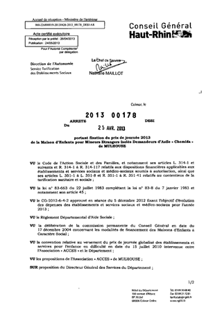 portant fixation du prix de journée 2013 de la maison d'enfants pour mineurs étrangers isolés demandeurs d'asile "Chemida" de MULHOUSE. Resumé Pièces jointes ARRETE Assemblée : Non défini Date : 25/04/2013 Rapporteur : Non défini Collectivité : Conseil départemental du Haut-Rhin Direction : Non défini Service : Direction de l'Autonomie Domaine : Prix de Journée Commission :