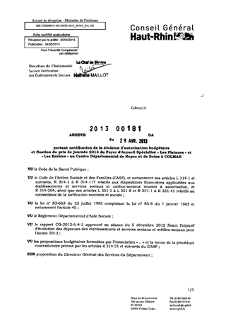 portant notification de la décision d'autorisation budgétaire et fixation du prix de journée 2013 du foyer d'accueil spécialisé "Les Platanes" et "Les Erables" au centre départemental de repos et de soins à COLMAR. Resumé Pièces jointes ARRETE Assemblée : Non défini Date : 29/04/2013 Rapporteur : Non défini Collectivité : Conseil départemental du Haut-Rhin Direction : Non défini Service : Direction de l'Autonomie Domaine : Prix de Journée Commission :