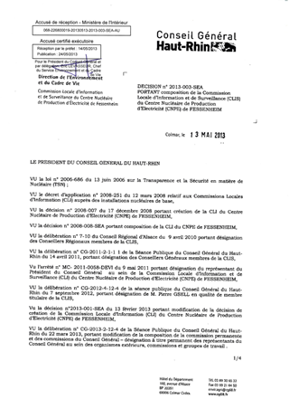 portant composition de la Commission Locale d'Information et de Surveillance (CLIS) du Centre Nucléaire de Production d'Electricité (CNPE) de FESSENHEIM. Resumé Pièces jointes ARRETE Assemblée : Non défini Date : 13/05/2013 Rapporteur : Non défini Collectivité : Conseil départemental du Haut-Rhin Direction : Non défini Service : Direction de l'Environnement et du Cadre de Vie Domaine : Autres (non classés) Commission :