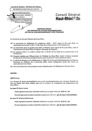 fixant les niveaux de loyers intermédiaires en cas de conventionnement avec travaux. Resumé Pièces jointes ARRETE Assemblée : Non défini Date : 13/05/2013 Rapporteur : Non défini Collectivité : Conseil départemental du Haut-Rhin Direction : Non défini Service : Service Habitat et Solidarités Territoriales Domaine : Autres (non classés) Commission :