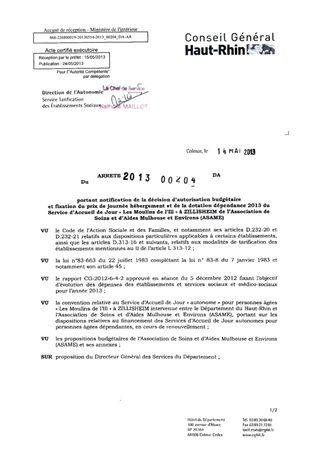 portant notification de la décision d'autorisation budgétaire et fixation du prix de journée hébergement et de la dotation dépendance 2013 du service d'accueil de jour "Les Moulins de 'Ill" à ZILLISHEIM de l'association de soins et d'aides Mulhouse et Env