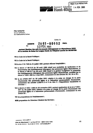 portant fixation des prix de journée hébergement et dépendance 2003 de la section de soins de longue durée de l'hôpital Loewel de MUNSTER. Resumé Pièces jointes ARRETE Assemblée : Non défini Date : 12/02/2003 Rapporteur : Non défini Collectivité : Conseil départemental du Haut-Rhin Direction : Non défini Service : Direction de la Solidarité Domaine : Prix de Journée Commission :