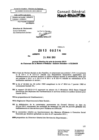 portant fixation du prix de journée 2013 de l'Internat de la Maison d'Enfants "Gustave Stricker" à ILLZACH. Resumé Pièces jointes ARRETE Assemblée : Non défini Date : 14/05/2013 Rapporteur : Non défini Collectivité : Conseil départemental du Haut-Rhin Direction : Non défini Service : Direction de l'Autonomie Domaine : Prix de Journée Commission :
