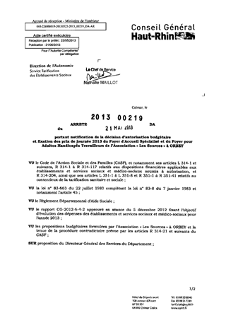 portant notification de la décision d'autorisation budgétaire et fixation des prix de journée 2013 du foyer d'accueil spécialisé et du foyer pour adultes handicapés travailleurs de l'association "Les Sources" à ORBEY. Resumé Pièces jointes ARRETE Assemblée : Non défini Date : 21/05/2013 Rapporteur : Non défini Collectivité : Conseil départemental du Haut-Rhin Direction : Non défini Service : Direction de l'Autonomie Domaine : Prix de Journée Commission :