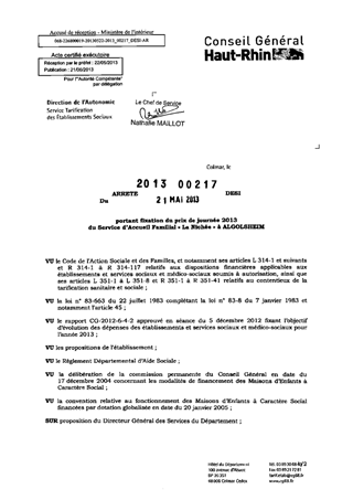 portant fixation du prix de journée 2013 du Service d'Accueil Familial "La Nichée" à ALGOLSHEIM. Resumé Pièces jointes ARRETE Assemblée : Non défini Date : 21/05/2013 Rapporteur : Non défini Collectivité : Conseil départemental du Haut-Rhin Direction : Non défini Service : Direction de l'Autonomie Domaine : Prix de Journée Commission :
