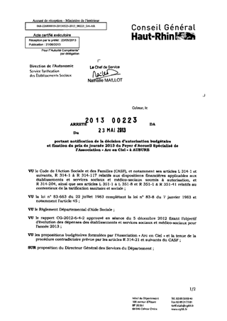 portant notification de la décision d'autorisation budgétaire et fixation du prix de journée 2013 du foyer d'accueil spécialisé de l'association "Arc-en-Ciel" à AUBURE. Resumé Pièces jointes ARRETE Assemblée : Non défini Date : 23/05/2013 Rapporteur : Non défini Collectivité : Conseil départemental du Haut-Rhin Direction : Non défini Service : Direction de l'Autonomie Domaine : Prix de Journée Commission :