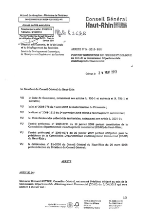 portant nomination du Président Délégué au sein de la Commission Départementale d'Aménagement Commercial. Resumé Pièces jointes ARRETE Assemblée : Non défini Date : 24/05/2013 Rapporteur : Non défini Collectivité : Conseil départemental du Haut-Rhin Direction : Non défini Service : Direction Générale Adjointe de l'éducation et de la culture, du développement et de l'aménagement des territoires et des infrastructures Domaine : Autres (non classés) Commission :