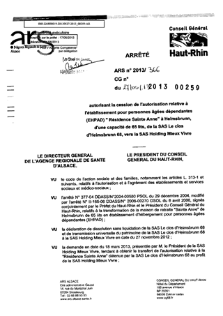 autorisant la cession de l'autorisation relative à l'établissement pour personnes âgées dépendantes (EHPAD) "Résidence Sainte Anne" à HEIMSBRUNN, d'une capacité de 65 lits, de la SAS Le Clos d'Heimsbrunn 68, vers la SAS Holding Mieux Vivre. Resumé Pièces jointes ARRETE Assemblée : Non défini Date : 27/05/2013 Rapporteur : Non défini Collectivité : Conseil départemental du Haut-Rhin Direction : Non défini Service : Direction de l'Autonomie Domaine : Personnes Agées Commission :