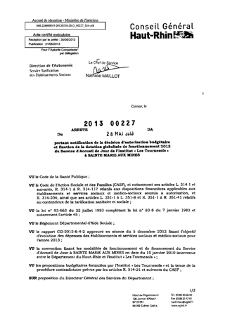 portant notification de la décision d'autorisation budgétaire et fixation de la dotation globalisée de fonctionnement 2013 du service d'accueil de jour de l'Institut "Les Tournesols" à SAINTE MARIE AUX MINES. Resumé Pièces jointes ARRETE Assemblée : Non défini Date : 28/05/2013 Rapporteur : Non défini Collectivité : Conseil départemental du Haut-Rhin Direction : Non défini Service : Direction de l'Autonomie Domaine : Dotations financières Commission :
