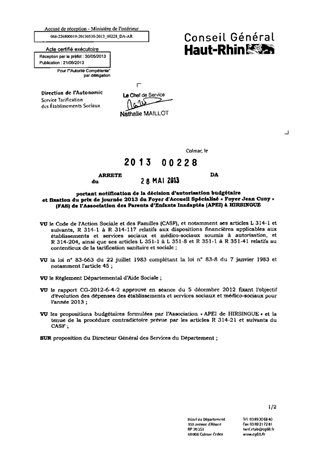 portant notification de la décision d'autorisation budgétaire et fixation du prix de journée 2013 du foyer d'accueil spécialisé "Foyer Jean Cuny" (FAS) de l'Association des Parents d'Enfants Inadaptés (APEI) à HIRSINGUE. Resumé Pièces jointes ARRETE Assemblée : Non défini Date : 28/05/2013 Rapporteur : Non défini Collectivité : Conseil départemental du Haut-Rhin Direction : Non défini Service : Direction de l'Autonomie Domaine : Prix de Journée Commission :
