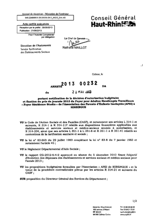 portant notification de la décision d'autorisation budgétaire et fixation du prix de journée 2013 du foyer pour adultes handicapés travailleurs "Foyer Résidence Studio" de l'Association des Parents d'Enfants Inadaptés (APEI) à HIRSINGUE. Resumé Pièces jointes ARRETE Assemblée : Non défini Date : 28/05/2013 Rapporteur : Non défini Collectivité : Conseil départemental du Haut-Rhin Direction : Non défini Service : Direction de l'Autonomie Domaine : Prix de Journée Commission :