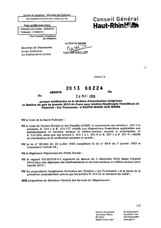 portant notification de la décision d'autorisation budgétaire et fixation du prix de journée 2013 du foyer pour adultes handicapés travaillereurs de l'Institut "Les Tournesols" à SAINTE MARIE AUX MINES. Resumé Pièces jointes ARRETE Assemblée : Non défini Date : 28/05/2013 Rapporteur : Non défini Collectivité : Conseil départemental du Haut-Rhin Direction : Non défini Service : Direction de l'Autonomie Domaine : Prix de Journée Commission :