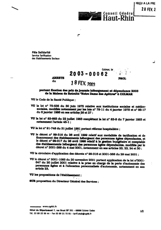 portant fixation des prix de journée hébergement et dépendance 2003 de la maison de retraite "Notre Dame des Apôtres" à COLMAR. Resumé Pièces jointes ARRETE Assemblée : Non défini Date : 18/02/2003 Rapporteur : Non défini Collectivité : Conseil départemental du Haut-Rhin Direction : Non défini Service : Direction de la Solidarité Domaine : Prix de Journée Commission :