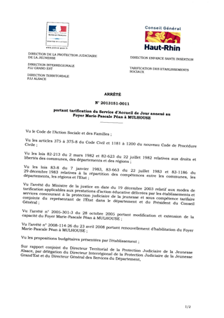 portant tarification du service d'accueil de jour annexé au foyer Marie-Pascale Péan à MULHOUSE. Resumé Pièces jointes ARRETE Assemblée : Non défini Date : 31/05/2013 Rapporteur : Non défini Collectivité : Conseil départemental du Haut-Rhin Direction : Non défini Service : Direction Enfance Santé Insertion Domaine : Prix de Journée Commission :