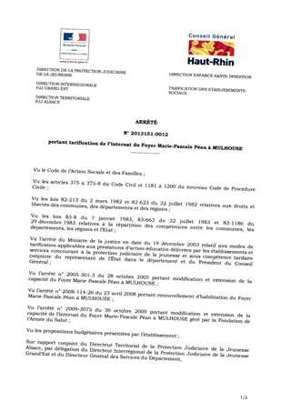 portant tarification de l'internat du foyer Marie-Pascale Péan à MULHOUSE. Resumé Pièces jointes ARRETE Assemblée : Non défini Date : 31/05/2013 Rapporteur : Non défini Collectivité : Conseil départemental du Haut-Rhin Direction : Non défini Service : Direction Enfance Santé Insertion Domaine : Prix de Journée Commission :