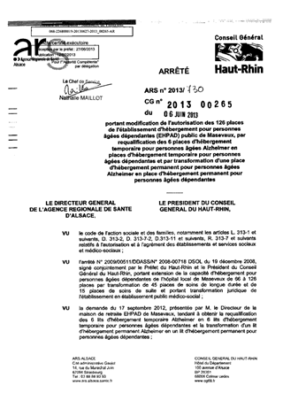 portant modification de l'autorisation des 126 places de l'établissement d'hébergement pour personnes âgées dépendantes (EHPAD) public de Masevaux, par requalification des 6 places d'hébergement temporaire pour personnes âgées Alzheimer en places d'héberg