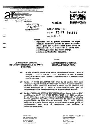 portant répartition des 60 places autorisées du foyer d'accueil médicalisé (FAM) de SAINTE MARIE AUX MINES, géré par l'établissement public social et médico-social "Les Tournesols" à SAINTE MARIE AUX MINES, par mode de prise en charge. Précision sur la cl