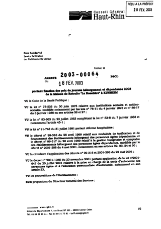 portant fixation des prix de journée hébergement et dépendance 2003 de la maison de retraite "La Roselière" à KUNHEIM. Resumé Pièces jointes ARRETE Assemblée : Non défini Date : 18/02/2003 Rapporteur : Non défini Collectivité : Conseil départemental du Haut-Rhin Direction : Non défini Service : Direction de la Solidarité Domaine : Prix de Journée Commission :