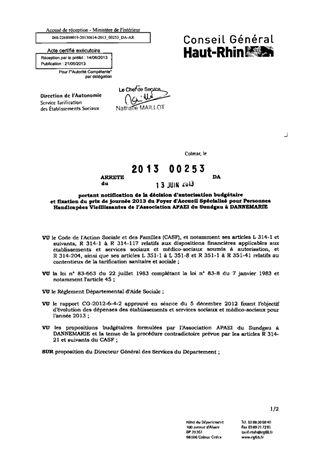 portant notification de la décision d'autorisation budgétaire et fixation du prix de journée 2013 du foyer d'accueil spécialisé pour personnes handicapées vieillissantes de l'Association APAEI du Sundgau à DANNEMARIE. Resumé Pièces jointes ARRETE Assemblée : Non défini Date : 13/06/2013 Rapporteur : Non défini Collectivité : Conseil départemental du Haut-Rhin Direction : Non défini Service : Direction de l'Autonomie Domaine : Prix de Journée Commission :