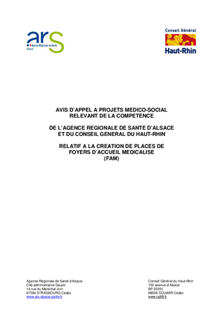 à projets médico-social relevant de la compétence de l'Agence Régionale de Santé d'Alsace et du Conseil Général du Haut-Rhin relatif à la création de places de foyers d'accueil médicalisé (FAM). Resumé Pièces jointes ARRETE Assemblée : Non défini Date : 13/06/2013 Rapporteur : Non défini Collectivité : Conseil départemental du Haut-Rhin Direction : Non défini Service : Direction de l'Autonomie Domaine : Autres (non classés) Commission :