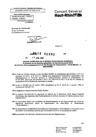 portant notification de la décision d'autorisation budgétaire et fixation de la dotation globalisée de fonctionnement 2013 du service d'accompagnement à la vie sociale de l'association "Croix-Marine" à MULHOUSE. Resumé Pièces jointes ARRETE Assemblée : Non défini Date : 14/06/2013 Rapporteur : Non défini Collectivité : Conseil départemental du Haut-Rhin Direction : Non défini Service : Direction de l'Autonomie Domaine : Dotations financières Commission :