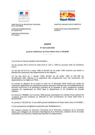 portant tarification du foyer Saint-Jean à COLMAR. Resumé Pièces jointes ARRETE Assemblée : Non défini Date : 17/06/2013 Rapporteur : Non défini Collectivité : Conseil départemental du Haut-Rhin Direction : Non défini Service : Direction Enfance Santé Insertion Domaine : Prix de Journée Commission :
