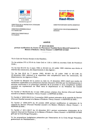 portant tarification du centre de placement familial socio-éducatif annexé à la maison d'enfants "Henry Dunant" à SEPPOIS LE BAS. Resumé Pièces jointes ARRETE Assemblée : Non défini Date : 17/06/2013 Rapporteur : Non défini Collectivité : Conseil départemental du Haut-Rhin Direction : Non défini Service : Direction Enfance Santé Insertion Domaine : Prix de Journée Commission :