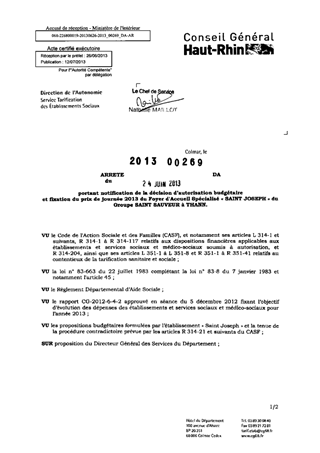 portant notification de la décision d'autorisation budgétaire et fixation du prix de journée 2013 du foyer d'accueil spécialisé "Saint Joseph" du groupe Saint Sauveur à THANN. Resumé Pièces jointes ARRETE Assemblée : Non défini Date : 24/06/2013 Rapporteur : Non défini Collectivité : Conseil départemental du Haut-Rhin Direction : Non défini Service : Direction de l'Autonomie Domaine : Prix de Journée Commission :