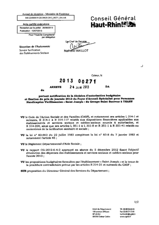 portant notification de la décision d'autorisation budgétaire et fixation du prix de journée 2013 du foyer d'accueil spécialisé pour personnes handicapées vieillissantes "Saint Joseph" du Groupe Saint Sauveux à THANN. Resumé Pièces jointes ARRETE Assemblée : Non défini Date : 24/06/2013 Rapporteur : Non défini Collectivité : Conseil départemental du Haut-Rhin Direction : Non défini Service : Direction de l'Autonomie Domaine : Prix de Journée Commission :