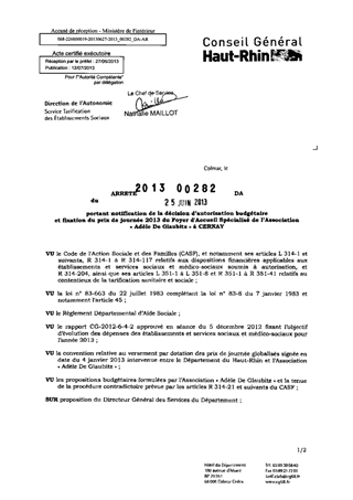 portant notification de la décision d'autorisation budgétaire et fixation du prix de journée 2013 du foyer d'accueil spécialisé de l'Association "Adèle de Glaubitz" à CERNAY. Resumé Pièces jointes ARRETE Assemblée : Non défini Date : 25/06/2013 Rapporteur : Non défini Collectivité : Conseil départemental du Haut-Rhin Direction : Non défini Service : Direction de l'Autonomie Domaine : Prix de Journée Commission :