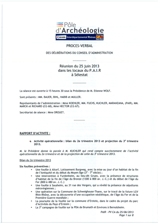 des délibérations du Conseil d'Administration du Pôle d'Archéologie Interdépartemental Rhénan - Réunion du 25 juin 2013. Resumé Pièces jointes ARRETE Assemblée : Non défini Date : 25/06/2013 Rapporteur : Non défini Collectivité : Conseil départemental du Haut-Rhin Direction : Non défini Service : Direction de la Culture et du Patrimoine Domaine : Autres (non classés) Commission :