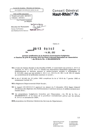 portant notification de la décision d'autorisation budgétaire et fixation du prix de journée 2013 du foyer d'accueil spécialisé de l'Association "Au Fil de la Vie" à MALMERSPACH. Resumé Pièces jointes ARRETE Assemblée : Non défini Date : 04/07/2013 Rapporteur : Non défini Collectivité : Conseil départemental du Haut-Rhin Direction : Non défini Service : Direction de l'Autonomie Domaine : Prix de Journée Commission :