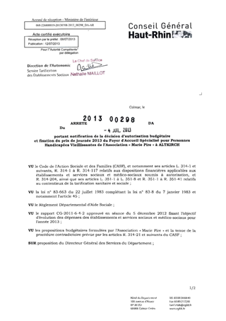 portant notification de la décision d'autorisation budgétaire et fixation du prix de journée 2013 du foyer d'accueil spécialisé pour personnes handicapées vieillissantes de l'association "Marie Pire" à ALTKIRCH. Resumé Pièces jointes ARRETE Assemblée : Non défini Date : 04/07/2013 Rapporteur : Non défini Collectivité : Conseil départemental du Haut-Rhin Direction : Non défini Service : Direction de l'Autonomie Domaine : Prix de Journée Commission :