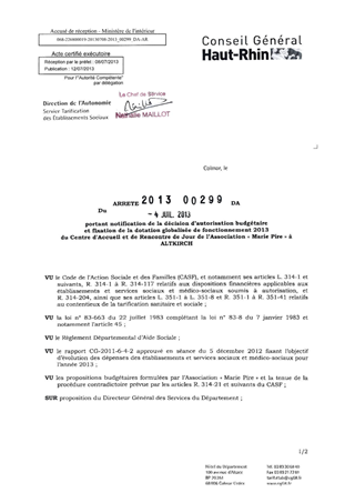 portant notification de la décision d'autorisation budgétaire et fixation de la dotation globalisée de fonctionnement 2013 du centre d'accueil et de rencontre de jour de l'Association "Marie Pire" à ALTKIRCH. Resumé Pièces jointes ARRETE Assemblée : Non défini Date : 04/07/2013 Rapporteur : Non défini Collectivité : Conseil départemental du Haut-Rhin Direction : Non défini Service : Direction de l'Autonomie Domaine : Dotations financières Commission :