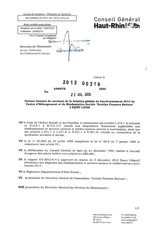 portant fixation du montant de la dotation globale de fonctionnement 2013 du centre d'hébergement et de réadaptation sociale "Soutien Femmes Battues" à SAINT LOUIS. Resumé Pièces jointes ARRETE Assemblée : Non défini Date : 22/07/2013 Rapporteur : Non défini Collectivité : Conseil départemental du Haut-Rhin Direction : Non défini Service : Direction de l'Autonomie Domaine : Dotations financières Commission :