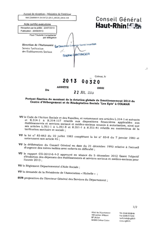 portant fixation du montant de la dotation globale de fonctionnement 2013 du centre d'hébergement et de réadaptation sociale "Les Epis" à COLMAR. Resumé Pièces jointes ARRETE Assemblée : Non défini Date : 22/07/2013 Rapporteur : Non défini Collectivité : Conseil départemental du Haut-Rhin Direction : Non défini Service : Direction de l'Autonomie Domaine : Dotations financières Commission :