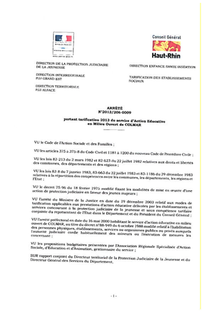 portant tarification 2013 du service d'Action Educative en milieu ouvert de COLMAR. Resumé Pièces jointes ARRETE Assemblée : Non défini Date : 25/07/2013 Rapporteur : Non défini Collectivité : Conseil départemental du Haut-Rhin Direction : Non défini Service : Direction Enfance Santé Insertion Domaine : Dotations financières Commission :