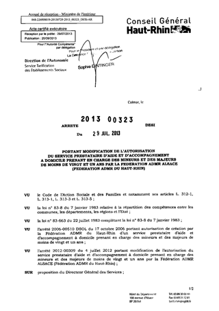 portant modification de l'autorisation du service prestataire d'aide et d'accompagnement à domicile prenant en charge des mineurs et des majeurs de moins de vingt et un ans par la Fédération ADMR Alsace (Fédération ADMR du Haut-Rhin). Resumé Pièces jointes ARRETE Assemblée : Non défini Date : 29/07/2013 Rapporteur : Non défini Collectivité : Conseil départemental du Haut-Rhin Direction : Non défini Service : Direction de l'Autonomie Domaine : Autres (non classés) Commission :