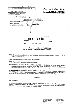 porttant fermeture du lieu de vie Ocarina sis au lieu-dit "Adelspach" 68150 AUBURE. Resumé Pièces jointes ARRETE Assemblée : Non défini Date : 29/07/2013 Rapporteur : Non défini Collectivité : Conseil départemental du Haut-Rhin Direction : Non défini Service : Direction de l'Autonomie Domaine : Autres (non classés) Commission :