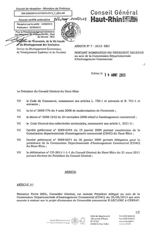 portant nomination du Président délégué au sein de la Commission Départementale d'Aménagement Commercial. Resumé Pièces jointes ARRETE Assemblée : Non défini Date : 14/08/2013 Rapporteur : Non défini Collectivité : Conseil départemental du Haut-Rhin Direction : Non défini Service : Direction Générale Adjointe de l'éducation et de la culture, du développement et de l'aménagement des territoires et des infrastructures Domaine : Autres (non classés) Commission :