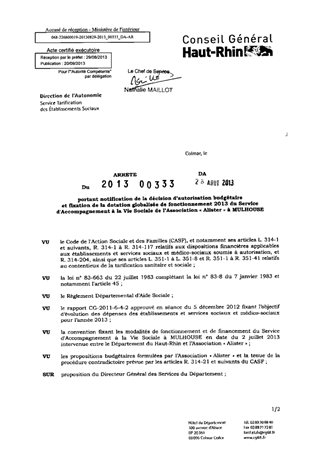 portant notification de la décision d'autorisation budgétaire et fixation de la dotation globalisée de fonctionnement 2013 du service d'accompagnement à la vie sociale de l'association "Alister" à MULHOUSE. Resumé Pièces jointes ARRETE Assemblée : Non défini Date : 28/08/2013 Rapporteur : Non défini Collectivité : Conseil départemental du Haut-Rhin Direction : Non défini Service : Direction de l'Autonomie Domaine : Dotations financières Commission :